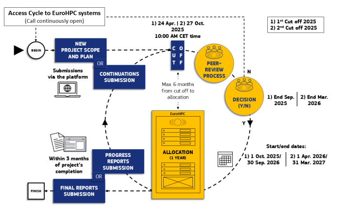 The Extreme Scale Access mode is designed for applications with high-impact, high-gain innovative research, open to all fields of science, industry and public sector justifying the need for and the capacity to use extremely large allocations in terms of compute time, data storage and support resources. This access mode distributes resources from the EuroHPC pre-exascale systems.