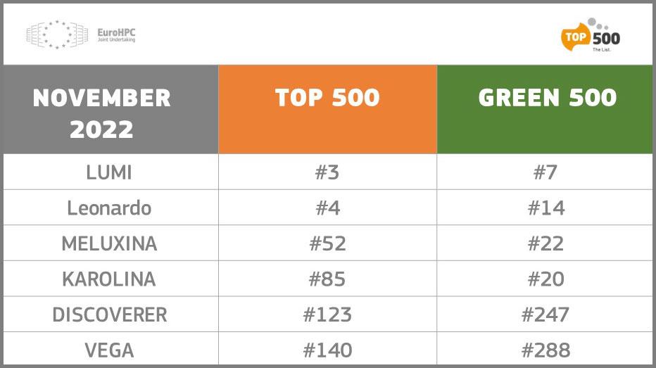 In the Green500 list, four EuroHPC supercomputers, LUMI in Finland, Leonardo in Italy, Karolina in Czechia and MeluXina in Luxembourg, rank among the top 25 greenest supercomputers in the world.