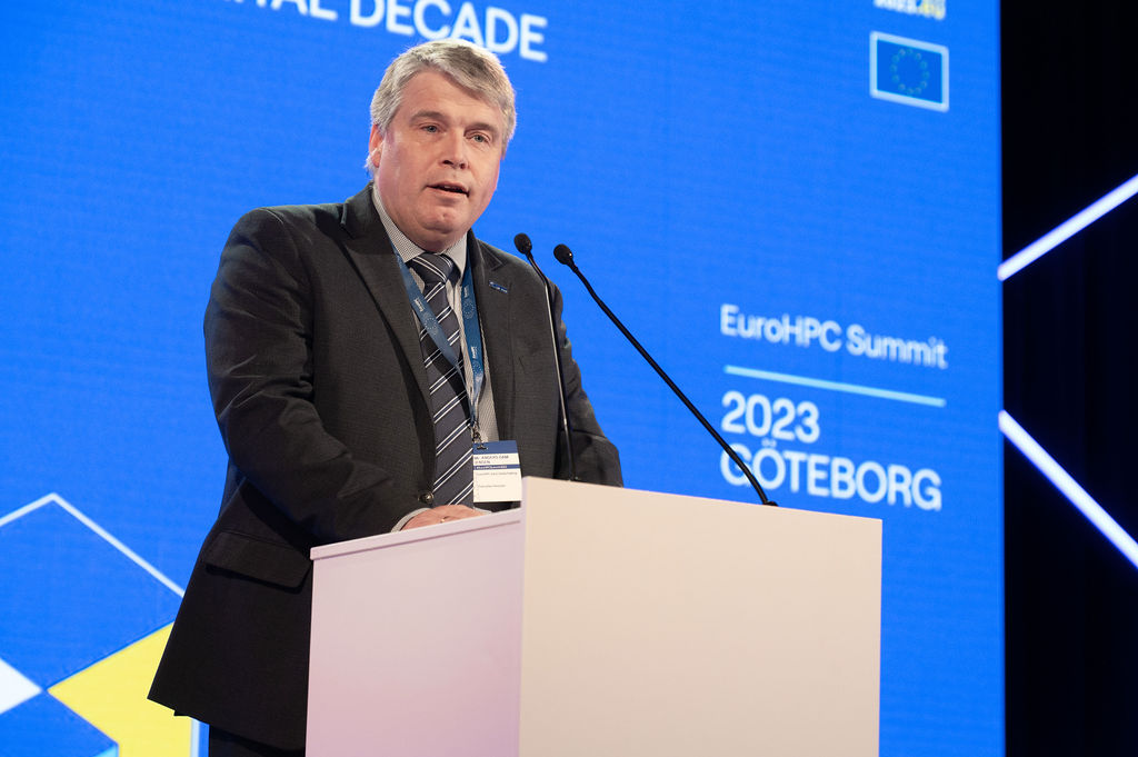 EuroHPC Summit 2023 05Gustav Kalbe, Head of Unit DGCONNECT, moderating the panel session on exascale computing during the Opening Plenary at the EuroHPC Summit 2023.